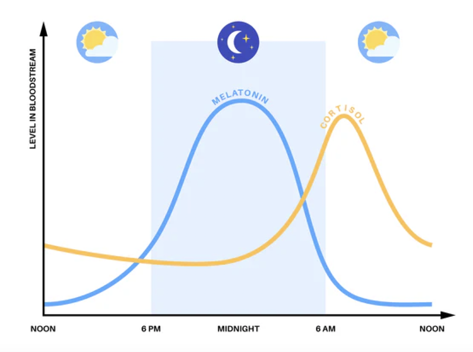 Our circadian rhythm is primarily reliant on the teamwork of two hormones - cortisol and melatonin. Cortisol is known as the “stress hormone,” and we need it to increase a healthy amount during the day to bring about wakefulness, alertness, motivation and productivity. It is highest in the morning and decreases throughout the day. Melatonin is the hormone that prepares our body for sleep. It is at its lowest in the day and naturally increases towards bedtime. Interestingly, the production of melatonin is reliant on darkness and disrupted by light. This is why we start to feel sleepy in dim light and as night falls, as well as why bright lights and screens wake us up.